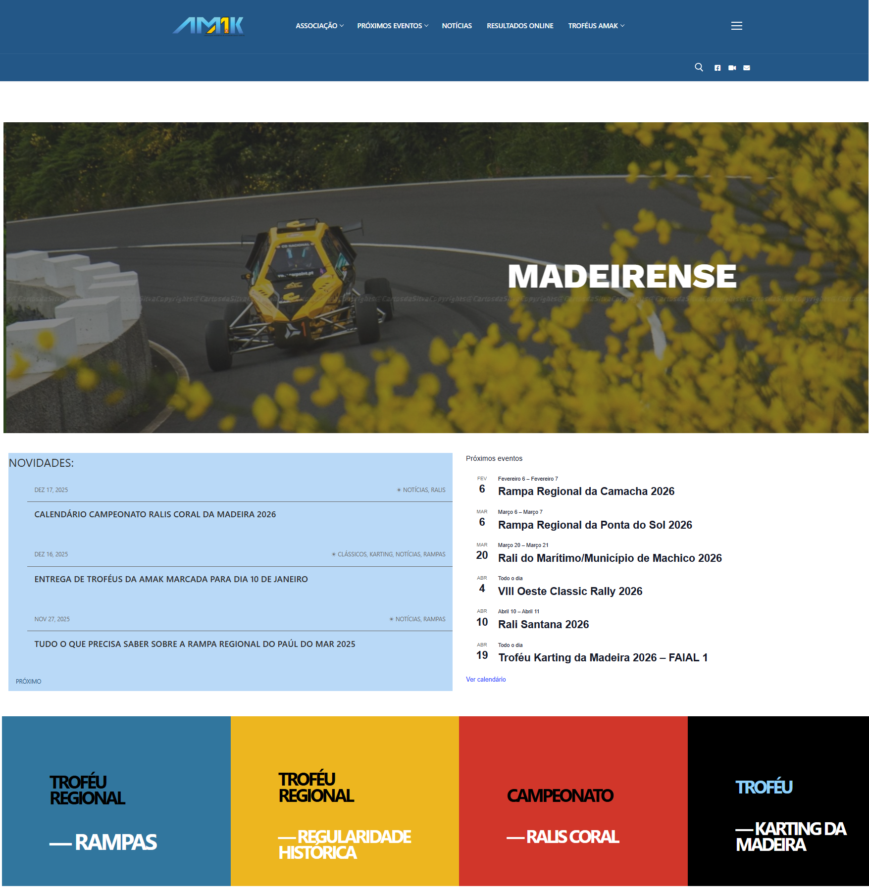 Site institucional da AMAK com nova imagem A Associação Madeirense de Automobilismo e Karting apresentou uma nova imagem no seu site institucional para 2026. Para aceder basta clicar no endereço: www.amak.pt Publicado emCLÁSSICOS, KARTING, NOTÍCIAS, RALIS, RAMPASArtigos relacionados Lista de Inscritos no Troféu Regional de Regularidade Histórica da AMAK 2026 Abril 17, 2026 Tudo o que precisa saber sobre o Rali de Santana 2026 Abril 10, 2026 Abertas inscrições para a Formação da AMAK para controladores e segurança em ralis e rampas Abril 8, 2026